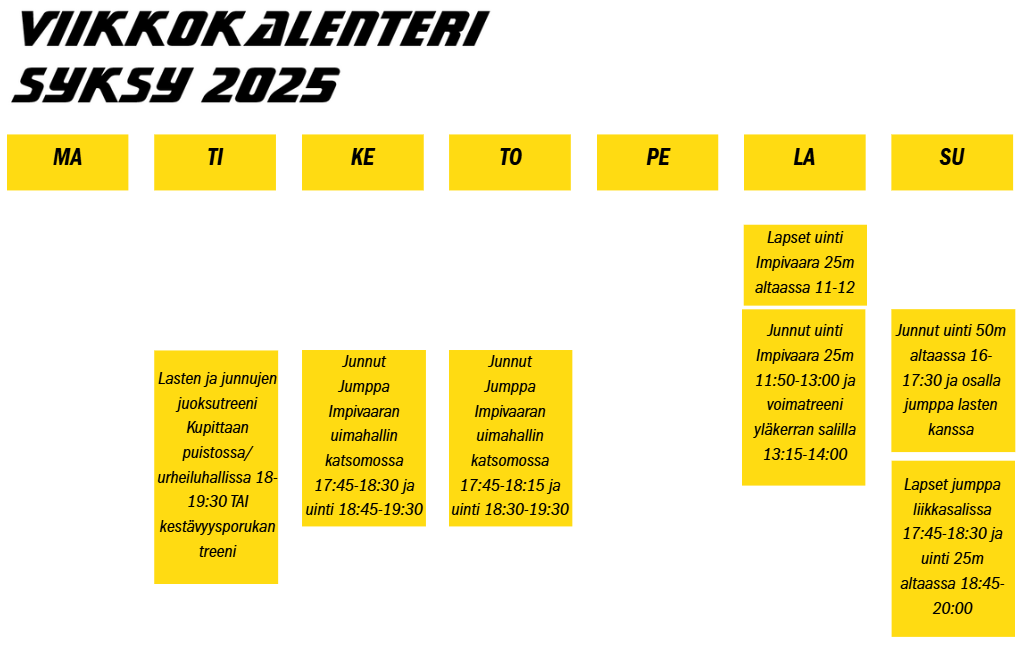 • Su 16.00-17.30 Uinti + 17.45-18.30 Jumppa, Impivaaran uimahalli