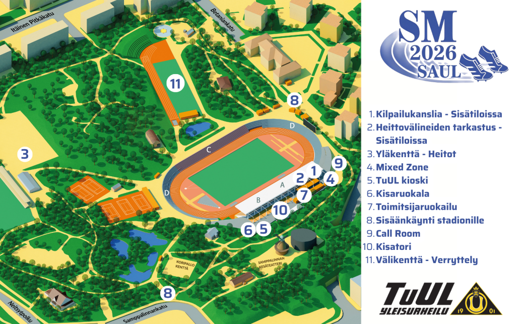 Turun Urheiluliitto järjestää Suomen Aikuisurheiluliiton yleisurheilun SM-kilpailut Turussa Paavo Nurmen stadionilla 26.-28.6.2026. Stadion sijaitsee Turun keskustan läheisyydessä osoitteessa Paavo Nurmen puistotie 9, 20800 Turku.